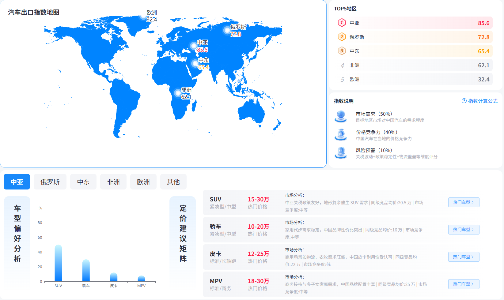 助力汽车出口市场布局决策、目标车型筛选、定价策略制定。