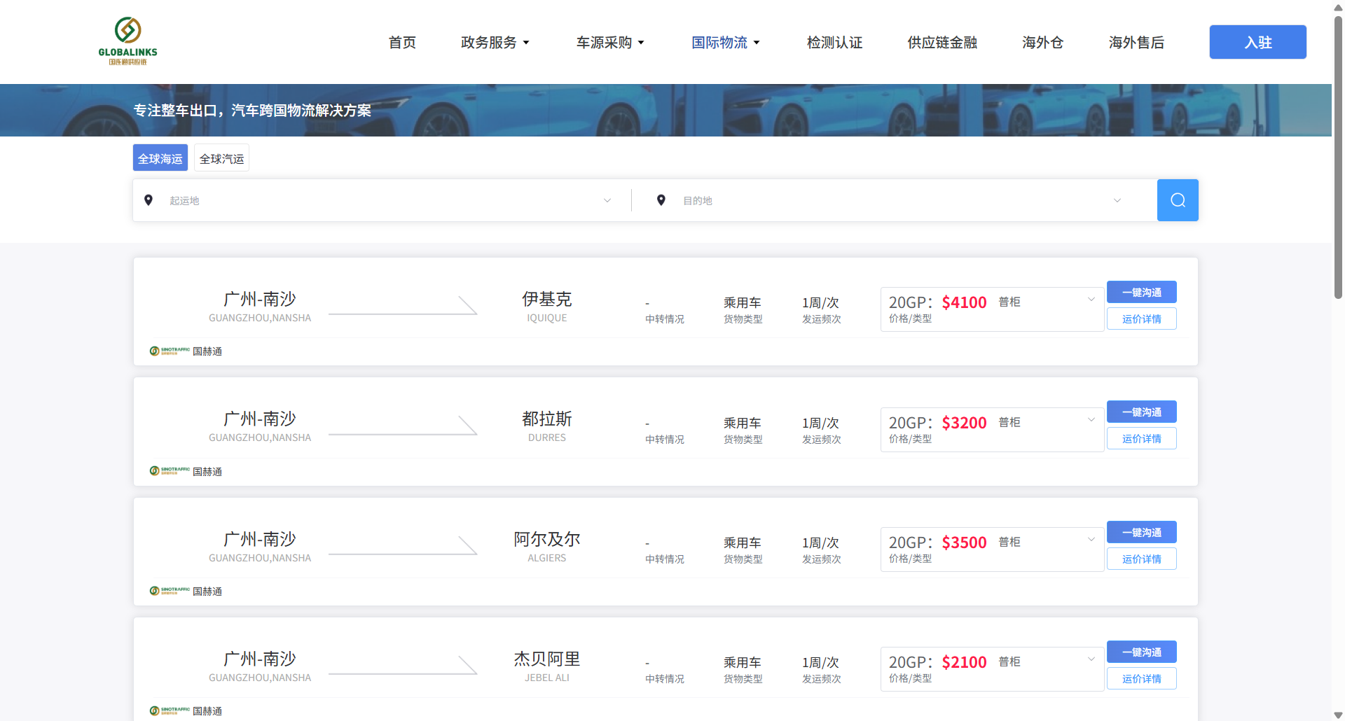 专为汽车出口企业量身打造,聚焦中东、中亚、南美、非洲等热门目标市场,提供覆盖海运、陆运及多式联运的全链条物流服务。支持在线实时查询全球航线运价。